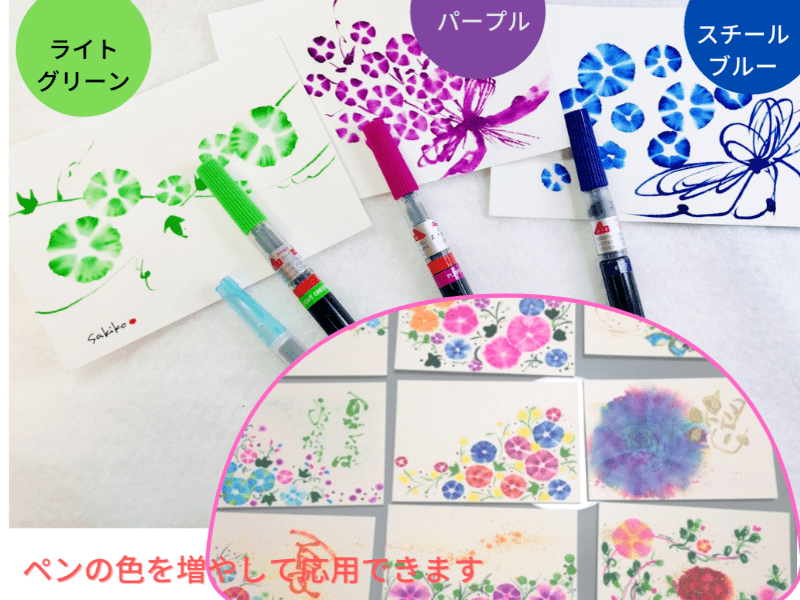 カラー筆ペンとお水で生まれる、偶然とは思えないグラデーションに感動しました。