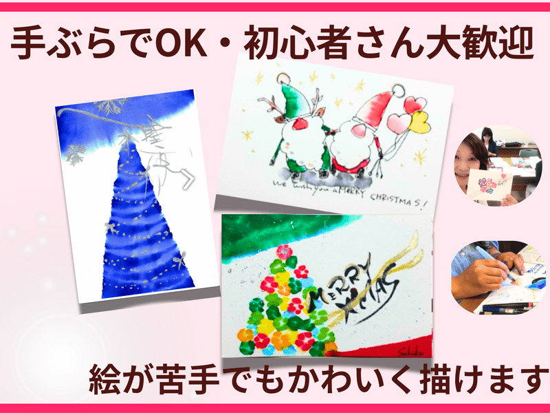 絵が苦手でも大丈夫。手ぶらでOK。はがきサイズでクリスマスプレゼントにもピッタリ。お客様へのDMにも活用。ご挨拶に、コミュニケーション力UP