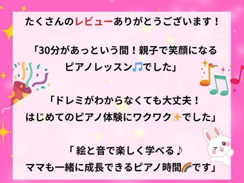 何より先生のお人柄が素敵で、笑顔がたくさんの楽しいレッスンだと思います。人見知りの娘も「先生、面白いからまたやりたい!」と嬉しそうでした。またぜひお願いいたします。