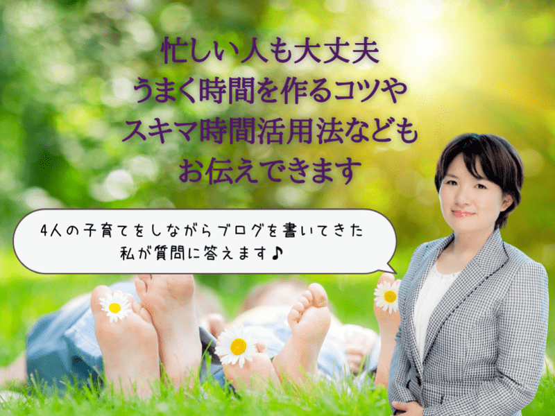 初めまして!私は4人の子育てをしながら、ブログアドバイザーとしてこれからブログを始める方に向けて講師をしています。