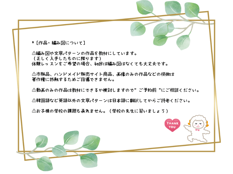 かぎ針編み、棒針編み、クロッシェレース編み、日本語・英語文章パターンの講座を開講しています。