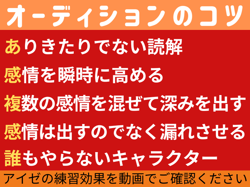 オーディション対策・役作り・セリフ術・台本練習・役の考えや気持ちを自分に落とし込む・キャラ作り・読解・癖をとる・殻を破る・想像力・集中力・表現力・上手に見せる聞かせる方法・初心者を一気に伸ばす・緊張をとる・朗読・スピーチなど。
