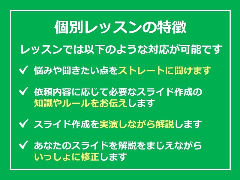 実務で必要となるテクニックをすぐ教えていただき、職場では聞けないパワポのコツを丁寧に教えていただきました。まさに駆け込み寺!とても助かりました!ありがとうございました!
