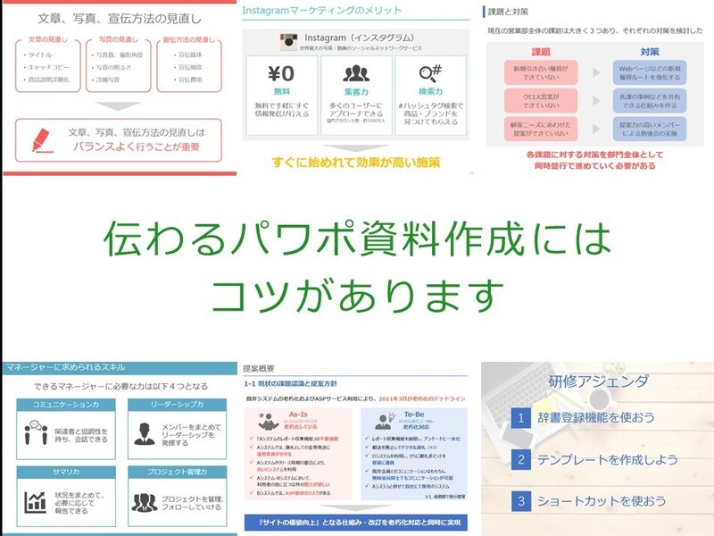 今でこそPowerPointで伝わる資料を効率的に作れるようになりましたが、初めからできたわけではありません。社会人生活の中で、セミナーや参考書などから知識を学んできたことはもちろんですが、現場で実際に出会う「伝わる資料」から...