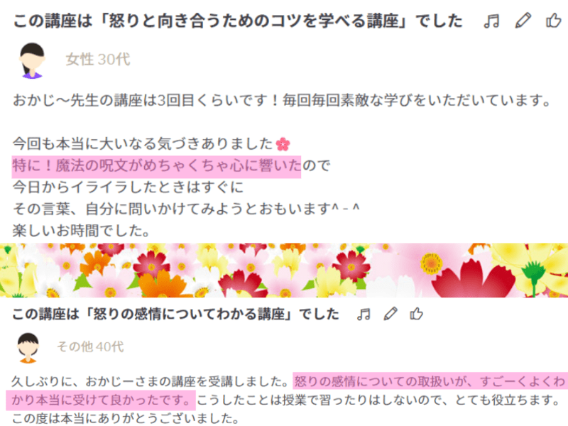 わたしはいつも嫌なことを嫌と言えなくて、我慢ばかりしてきて、爆発してしまうことが多かったのですが、先生の講座を受けて、怒りのコントロールの仕方や対処法を知ることができて良かったです☺️☺️🐻