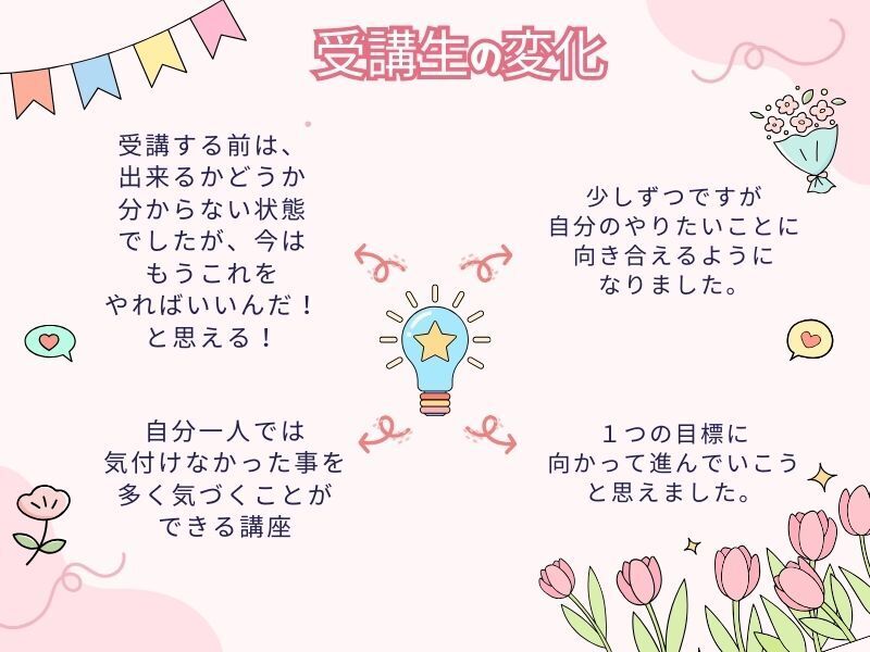 なりたい自分を実現するために、先生が本当にさまざまな視点から寄り添ってくださり、目標達成に向けてしっかりとサポートしていただける講座でした。