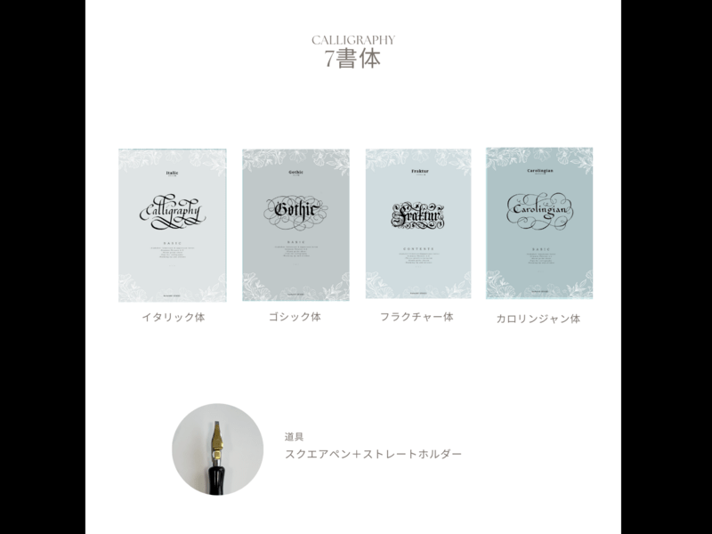 道具はご自身でご用意ください。書体によってペン先・ペン軸が違うのでご注意ください。