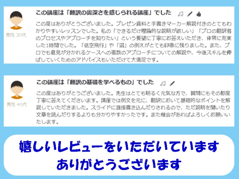 この度はありがとうございました。先生はとても明るく元気な方で、質問にもその都度丁寧に答えてくださいます。講座では例文を元に、翻訳において基礎的なポイントを解説していただきました。スライドに直接書き込んだりされるので、ただ説明を聞いたり文章を読んだりするよりも分かりやすかったです。また機会があればよろしくお願いいたします。