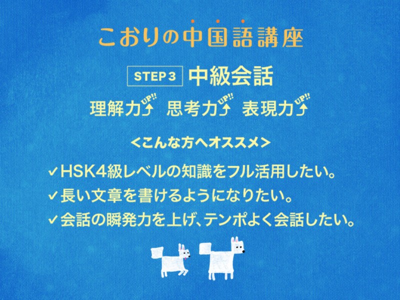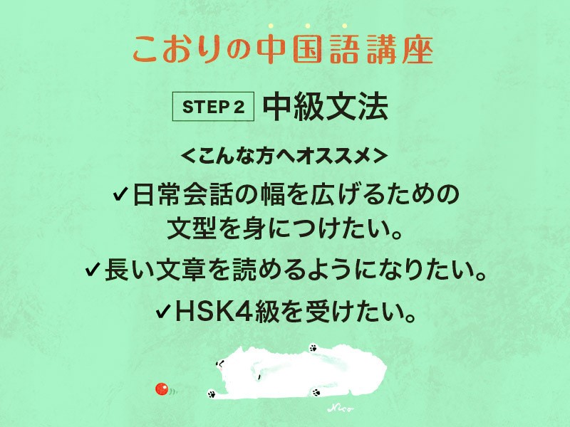 初級文法の復習も兼ねて進めていきますので、独学などで初級(HSK3級相当)を学習済で、初めて私のレッスンに参加される方でも安心です。