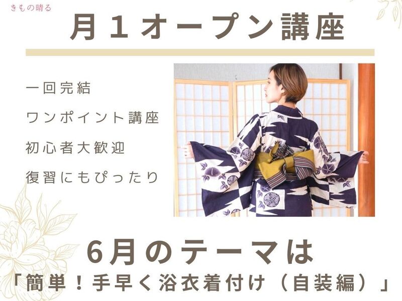 【手ぶら参加OK】そろそろ暑くなってくるこの頃。 綺麗に浴衣をパッと手早く着られるようになりたい! そんな方にぴったりな講座です。