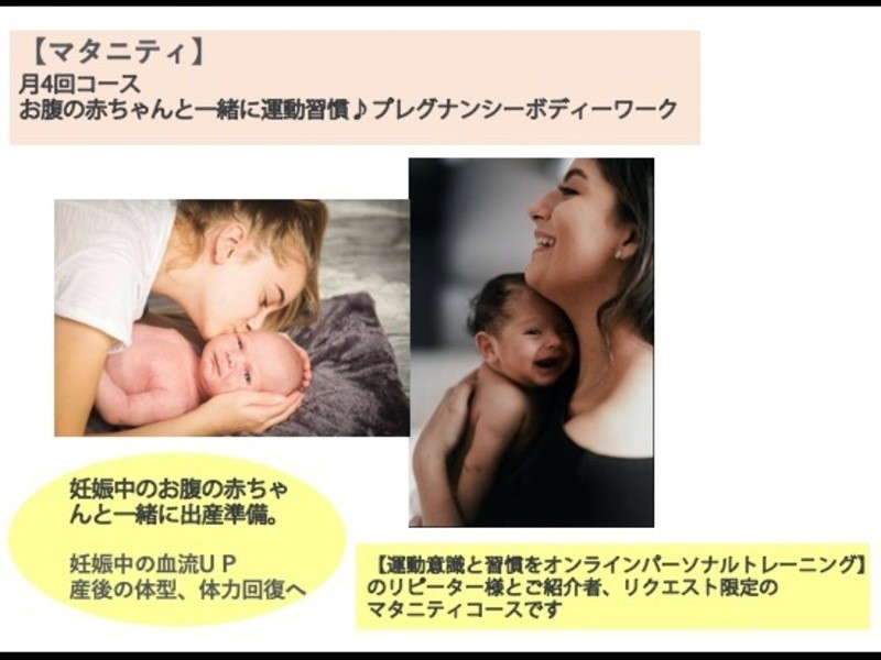 妊娠前から運動経験のある妊婦さんのための運動習慣を続けるためのレッスンをおこないます。