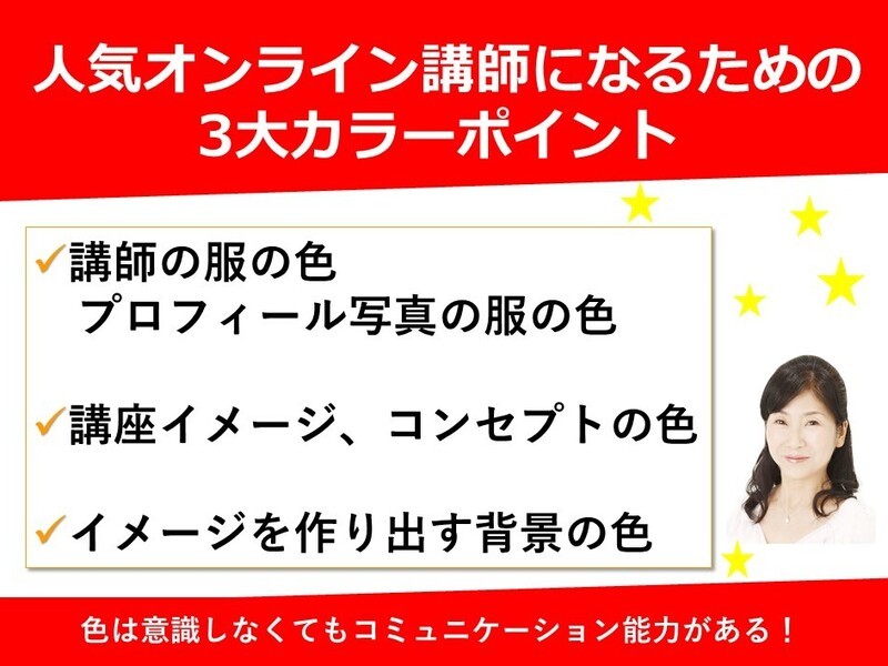 とにかく先生の豊富な知識と実際、人は色でどのように感じるかを体感させてくれるとても楽しく勉強になる講座でした!自分の似合う色だけではなく、自分をどのように見せたいかによってどの色を使えばいいのかなど、とても詳しく教えていただき、その上、マンツーマンでこのお値段!本当に素晴らしい講座でした。早速、オンライン講座で着るためのトップスを買いに行こうと思います。本当に、ありがとうございました。