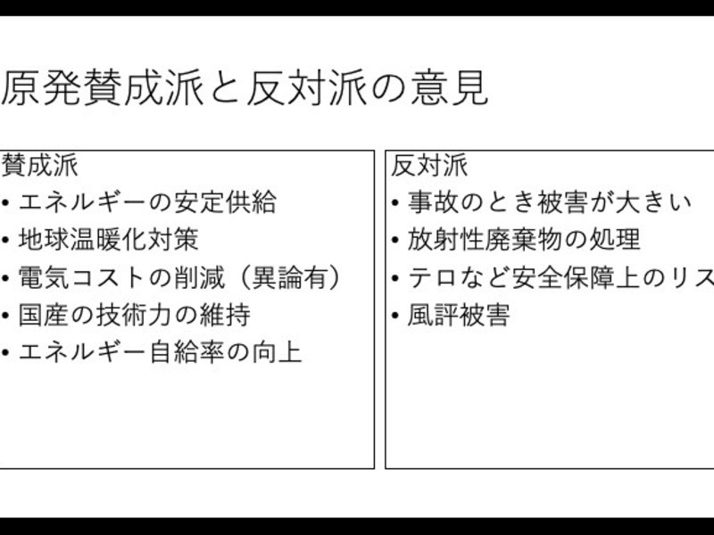 最初に先生から、自分は原発賛成派で、自分の物の見方が講座にあらわれてるかも知れないから、反対派の人は疑ってかかって調べ直す位で丁度いいです、と言われました。でも、何に対してもちゃんとメリットデメリットを言ってくれるので、偏っているとは全く思えず、むしろ色んな事を知れて良かったと感じました。