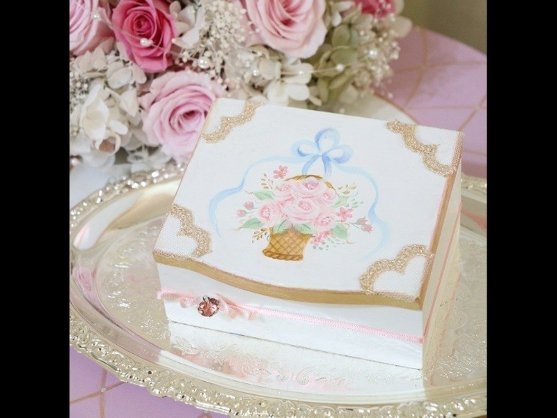 カード収納ボックスにリボン、フラワーをペイント。使うことができる作品を作ることができるのもトールペイントの魅力です♪