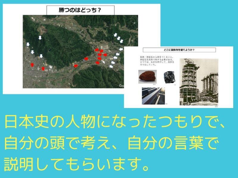 ◎思考力を鍛える日本史:「日本初の製鉄所をつくりたい。どんなところにつくりますか?それはなぜですか?」と問いかけます。