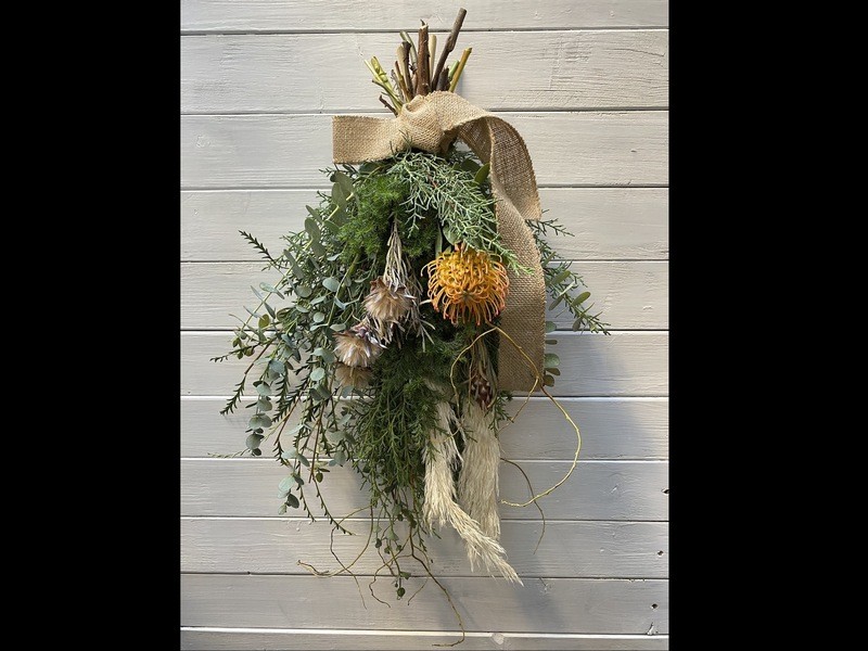 はじめてさん・初心者さんが多い教室です。香りも楽しめる天然素材を使ったスワッグ(壁掛け花束)に挑戦してみませんか。
