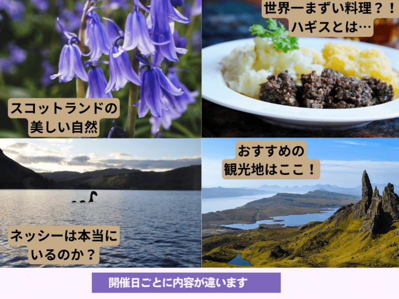 スコットランドの歴史や文化など分かりやすく説明していただきありがとうございます。写真などの資料と共に、体験を話してくださったのでどんどん引き込まれていきました。最近はなかなか旅にでる機会がありませんできたが、お話を聞いて気持が晴れやかになりました。とても楽しい時間でした。