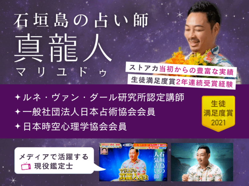 20代より西洋占星術を学び、社会人経験を経て2017年より占い師に。LINE占い「石垣島の宿命師マリユドゥ」の監修も手掛ける。ルネ・ヴァン・ダール研究所認定講師。日本時空心理学協会会員。一般社団法人日本占術協会会員。ノエル・ティル式心理占星術マスタープログラム修了認定心理占星術家。