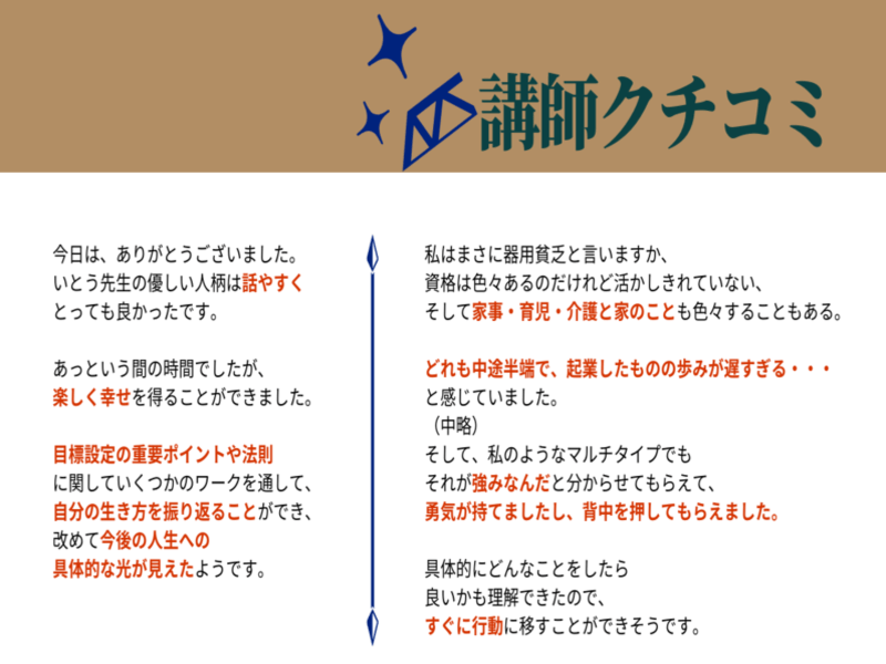 実際に講座を受けてみて、先生の体験談や想いを織り交ぜながらのお話がとても分かりやすくて、すっと心に入ってきました。そして、私のようなマルチタイプでもそれが強みなんだと分からせてもらえて、勇気が持てましたし、背中を押してもらえました。具体的にどんなことをしたら良いかも理解できたので、すぐに行動に移すことができそうです。とても満足度の高い講座でした。参加できてよかったです。もとみ先生ありがとうございました!