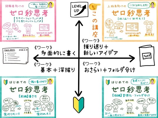 ゼロ秒思考のA4メモ書きを毎日することと同じくらいフォルダ分けは大事、そんなことを教えて頂きつつ実際に自分のメモ書きを整理しながら振り返るワークも多く、気づきをもらえる講座です。