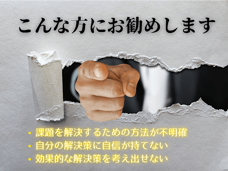 問題解決能力を身につけ、組織内での評価を高めたい方にぴったりです。