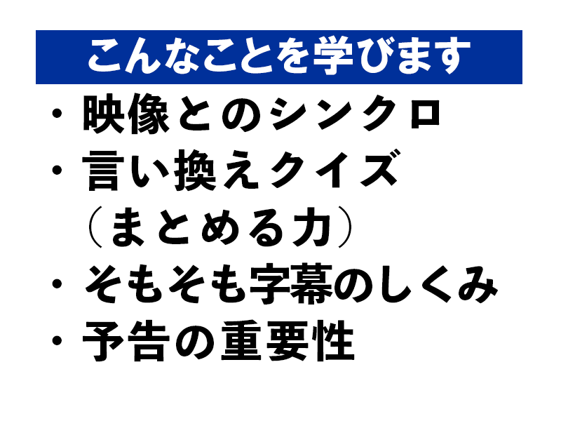 字幕翻訳ならではの技法を学ぶことが出来ます。