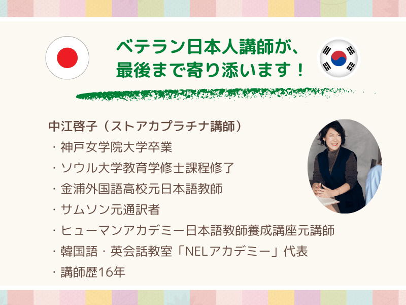 ◆ 在韓歴8年、講師歴16年、講師養成歴4年、教室運営歴8年