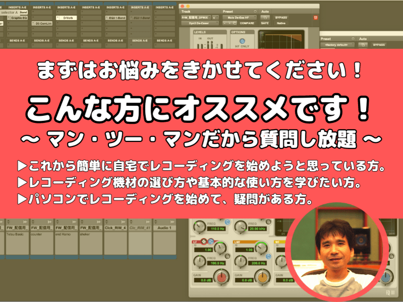 私はこれまで独学でレコーディングをしてきましたが、なんとなく行っている部分が多くありました。今回の講座を受けて、基礎がよく分かり、なるほどそうだったのか!と腑に落ちるようなことがたくさんありました。私の質問にもすべて丁寧にお答えいただき、これまで誰に聞いたらいいのかというようなことも一瞬にして解決いたしました。また何か疑問がでてきましたら先生にお伺いしたいです。