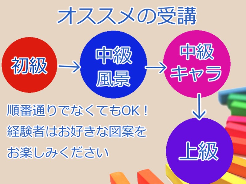 他の初級の図案や、中級(風景・キャラ)講座をお楽しみください!