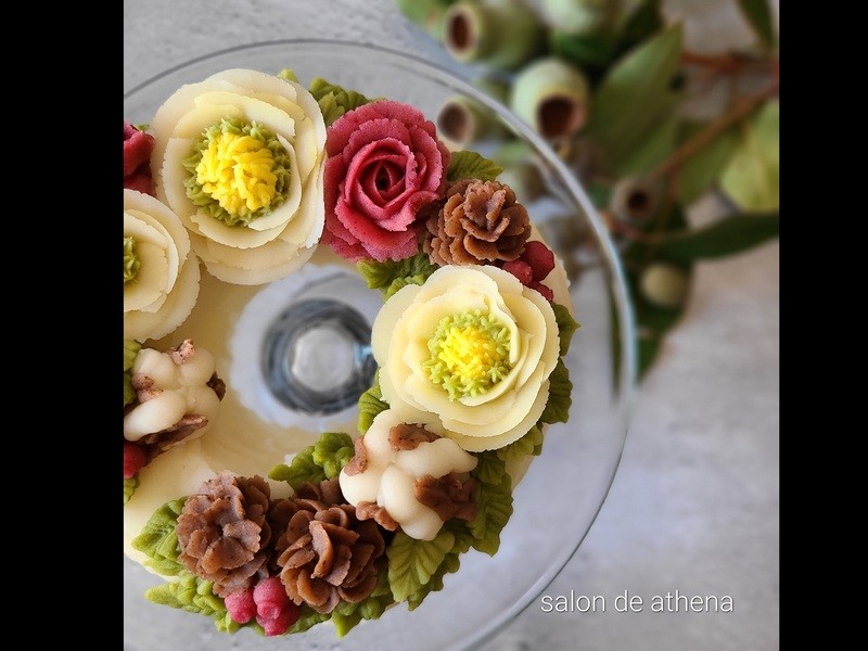 おはぎのクリスマスリース作り、それだけでもワクワクしてしまいますが、今回は素敵なお花をあんこで飾る、、、不器用な私にも出来るか?心配でしたが、高齢の母親が大のおはぎ好きで、おはぎの概念が変わるかもしれませんが、こんな世界もあるのよ!と話題性も含め、飛び込んだアンフラワーの世界。先生の細やかなご配慮&ご指導に一つの作品が出来上がりました。可愛らしく、そして可憐なお花に心わしづかみにされました(笑)とても楽しく受講させて頂きました。有難う御座いました。