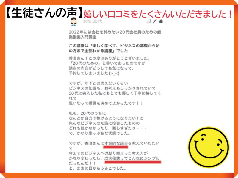 かすみ先生の講座では、私が困っていることを一つずつ解消してくれたので、とてもわかりやすかったです!!