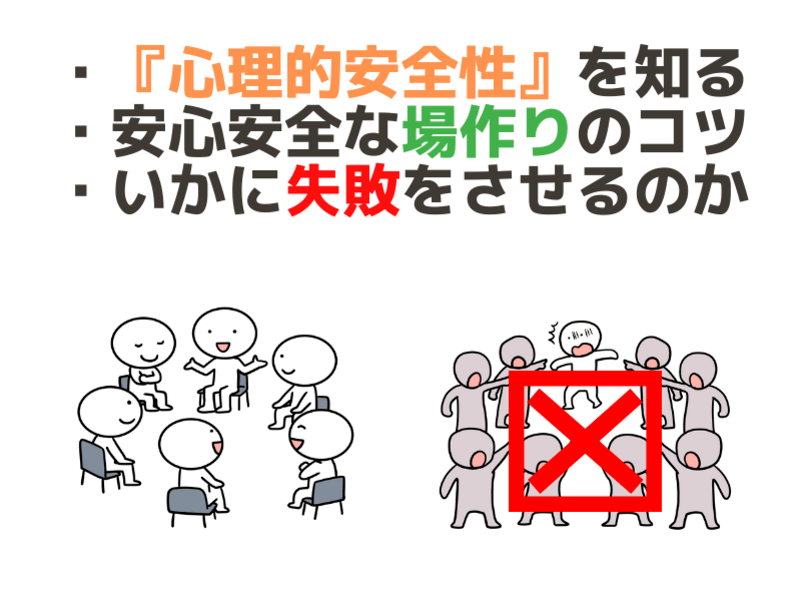 心理的安全を相手に感じてもらうためには、相手を思いやった言動をすることはもちろん、その前に自分自身の人間としての素の部分や弱みを出したり、想いを日々語っていくことも大切だと新たな気づきがありました。