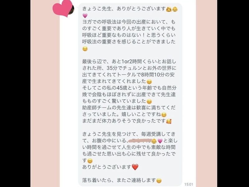 出産も近いので、為になるメニューばかりで、勉強になりました。時間がある時教えてくれたヨガを家でもやりたいと思います。ありがとうございました。