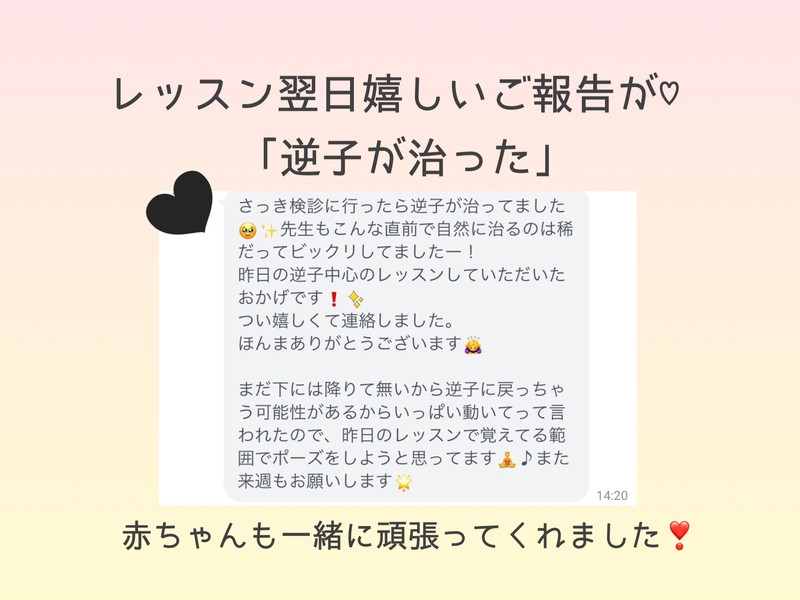 完全にヨガ初心者ですが、先生がこちらの様子をよくみてくださるので安心して参加することができました。お腹が大きくても無理なくできるヨガなので、出産まで続けられそうです!ありがとうございました!