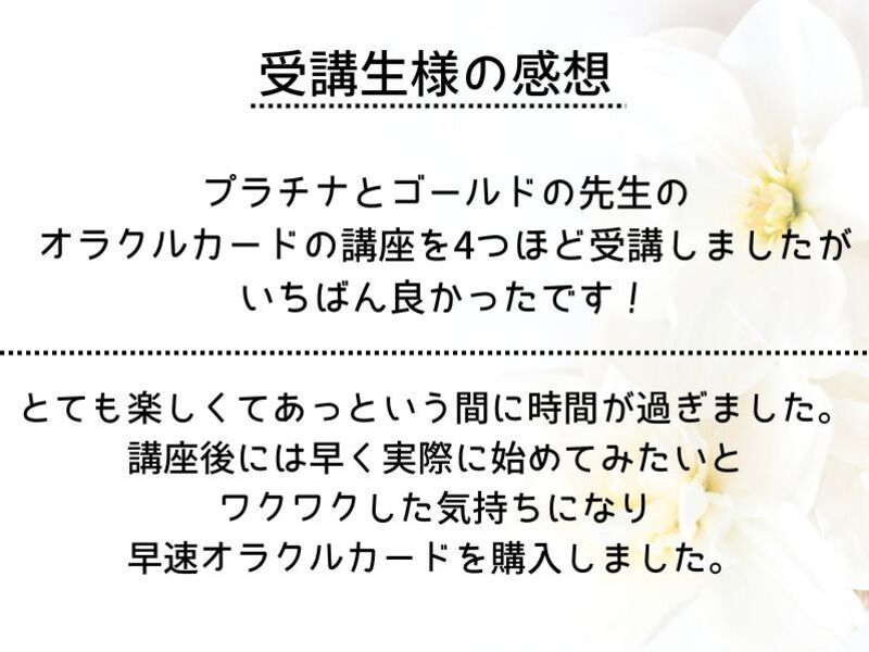 オラクルカードの歴史、海外や日本でどう広がったか、カードの読み取り方、具体的なカードリーディングの方法など大変わかりやすかったです。質問もしやすかったです☆すぐ実践したくなる講座でした。ありがとうございました!