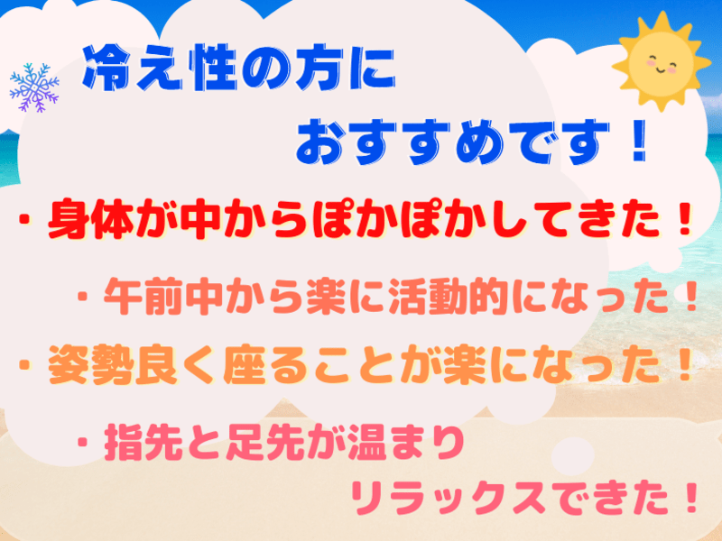 翌朝、教えていただいた深呼吸をしてみると、いつもより温まる感じがして、寝つきも良かったです。