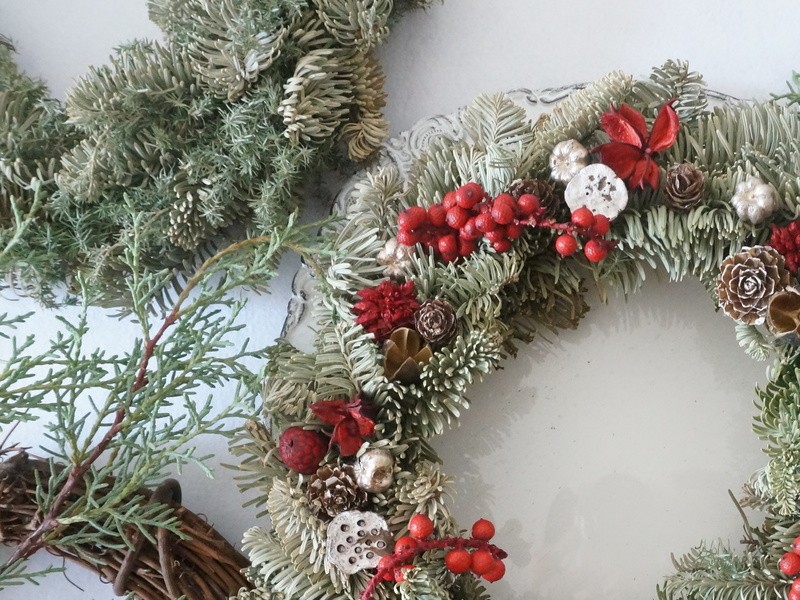 フレッシュのエバーグリーンを使用したクリスマスリースを作成いたします。