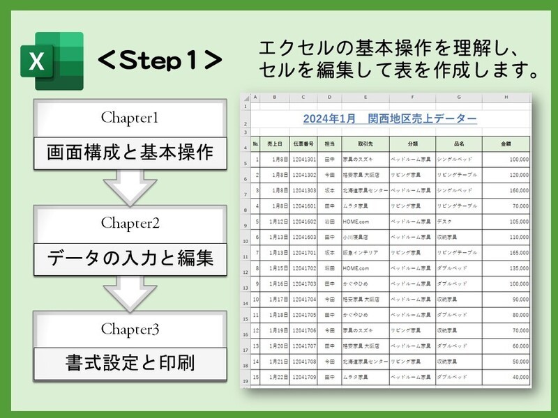 Excelの基本操作から始め、表の作成の基礎を学びます。基本的な操作や技術を習得し、Excelの使い方に自信を持つことがステップ1の目標です。