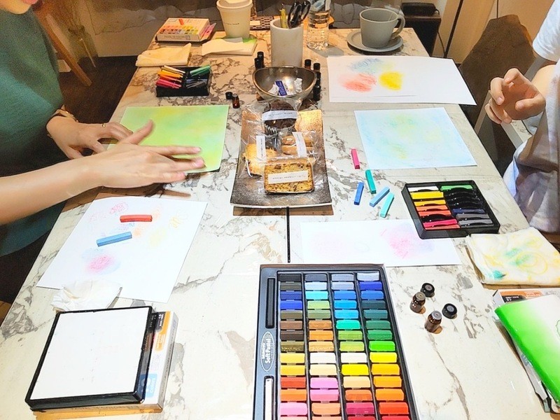 5種類のアロマから今日一番好きな香りを選び、そのイメージをソフトパステルで自由に表現するレッスンです。初心者さん大歓迎♪