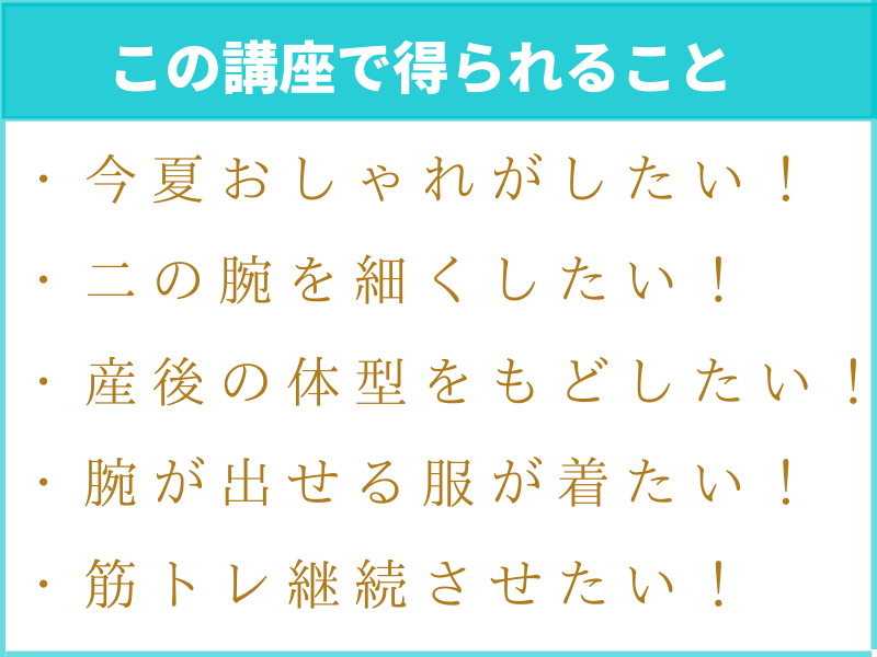 また、理論から体験、イメージで、二の腕が細くなる内容に実感がわきました。三の腕筋肉が動いているイメージをしながら続けたいと思います。そして、夏にはノースリーブを着れるイメージで頑張ります!ありがとうございました。