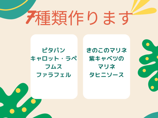 結果、自家製ピタパンの作り方、フムス、野菜やきのこのマリネ、タヒニソース(←美味しい!!)などなど、盛り沢山の内容で、完成したサンドもカラフルで栄養バランス満点で、大満足でした。おもてなしにもピッタリだし、フムスはメキシカンなどにも活用できそう!