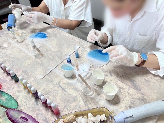 楽しく体験していただけで、よかったです。エポキシレジンアートは、奥が深いので、やればやるほど、ハマりますよ⭐︎硬化しましたら、発送致しますので、到着をお楽しみに♪