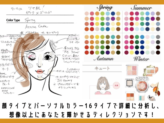 16タイプパーソナルカラー、顔タイプ診断、骨格診断のうちどれかお一つを選んでいただいて、