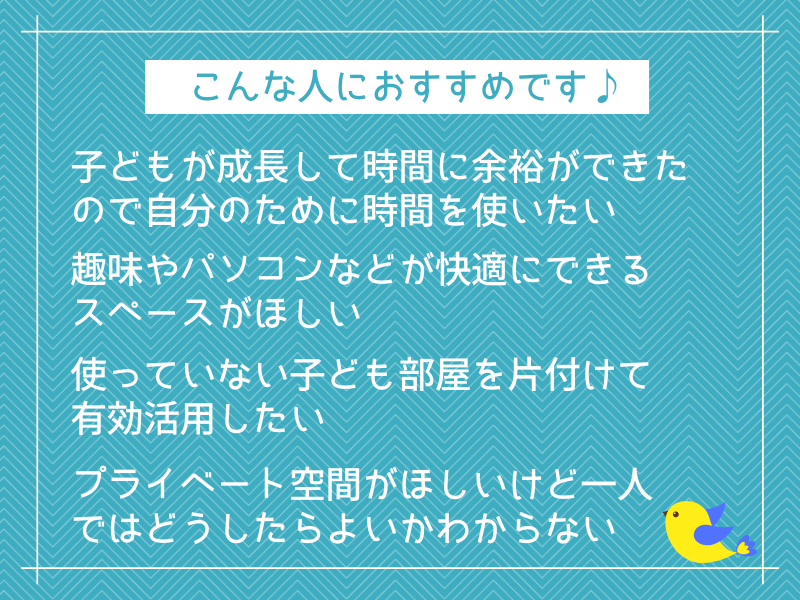 受講したきっかけは春休みに子供部屋を整理していた際に自分のスペースも欲しいと思い、講座を探していた際に目に止まった事から、50代手前でしたが受講を決めました。
