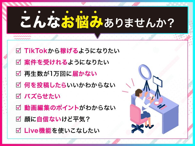 実際にTikTokで人気の先生が、丁寧にそのコツを教えてくださるので、とても実践的で、大変役に立ちました。今までどうしたらいいか立ちすくんでいたのですが、疑問が解決でき、有意義な時間となりました。自分が今後どのようなことをしていったらいいのかがわかったので、今後色々と試しながら頑張ってみます。ありがとうございました。
