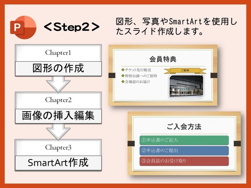 プレゼンテーションを視覚的に魅力的にするためのスキルを学びます。図形や画像を効果的に活用し、スライドにインパクトを与える方法を習得します。また、SmartArtを使用して情報をわかりやすく整理し、視覚的に伝わりやすいスライドを作成することができます。