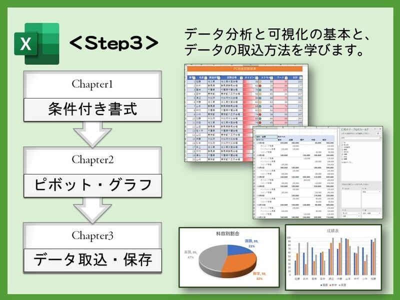 条件付き書式やピボットテーブルを使ったデータ分析と可視化の方法を学びます。さらに、外部データのインポートやエクスポート手法も習得し、データの効果的な処理と視覚化を実践します。