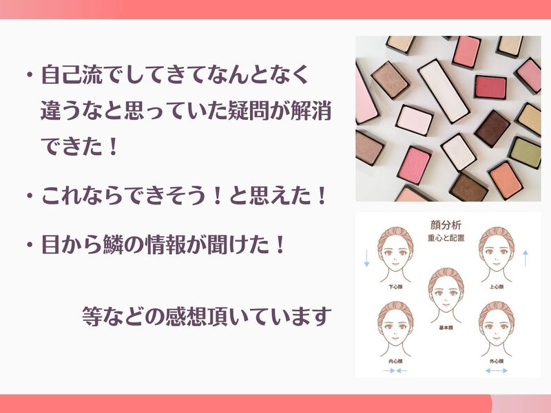 メイクの基礎を学びたくて申し込んだのですが、メイクのやり方だけでなく、考え方に対して目から鱗が落ちました。