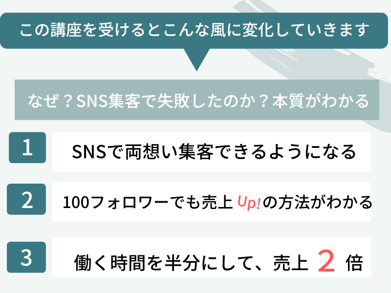 本講座では、「お客様からのお申し込みに繋がるSNSの役割」についてもしっかり解説していきます。