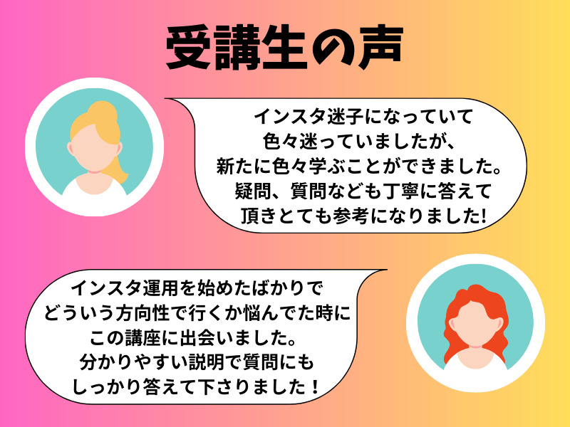 インスタは専門用語や機能が多くて難しく感じていましたが、投稿の種類ごとの役割や使い分けまで分かりやすく説明してもらえたので、モヤモヤしていた部分がクリアになりました!